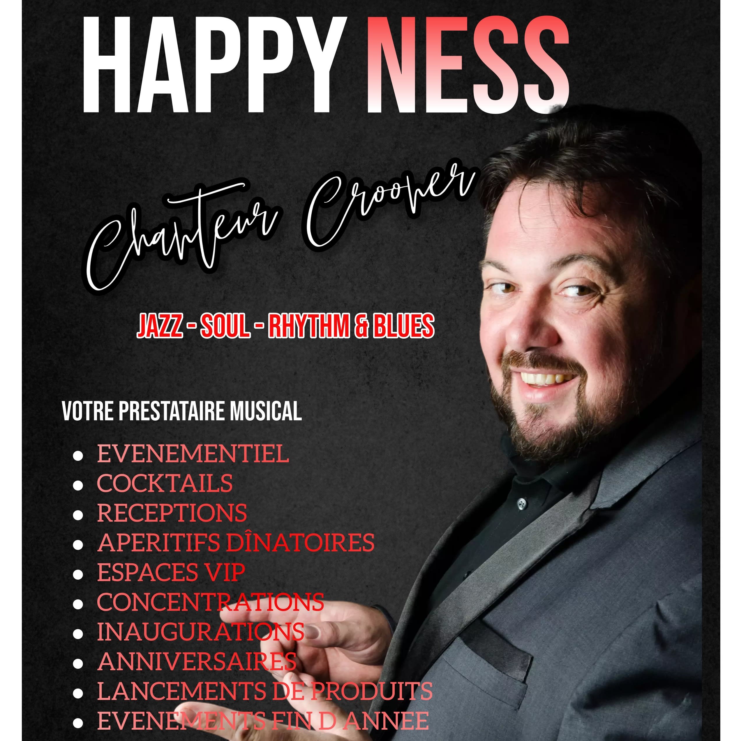 Talentueux Crooner aussi à l’aise dans le jazz traditionnel, la soul et le rhythm'n'blues, HAPPYNESS offre à votre événement tout le prestige d'un vrai crooner à la voix intensément chaleureuse.et sensuelle.