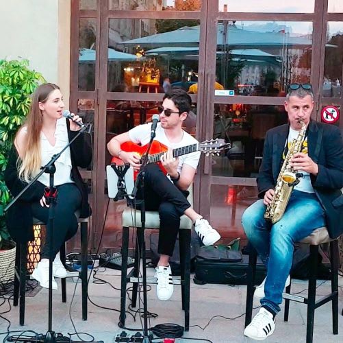 Nous sommes un trio composé d'un guitariste, d'une chanteuse et d'un saxophoniste OU percussionniste. Notre style ? Essentiellement de la pop anglo-saxonne mais aussi du jazz, du blues, un peu de rock et de la variété française, avec certaines musiques revisité de manière flamenco ! Pour ceux qui le souhaitent, nous proposons en première partie : une prestation de jazz manouche et/ou de flamenco.